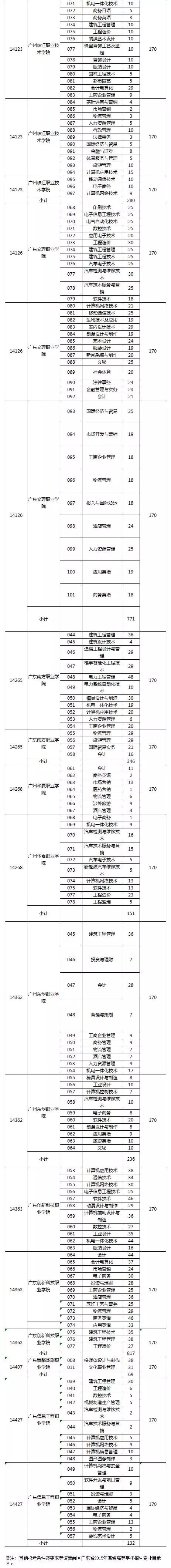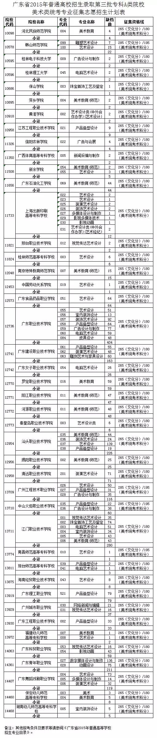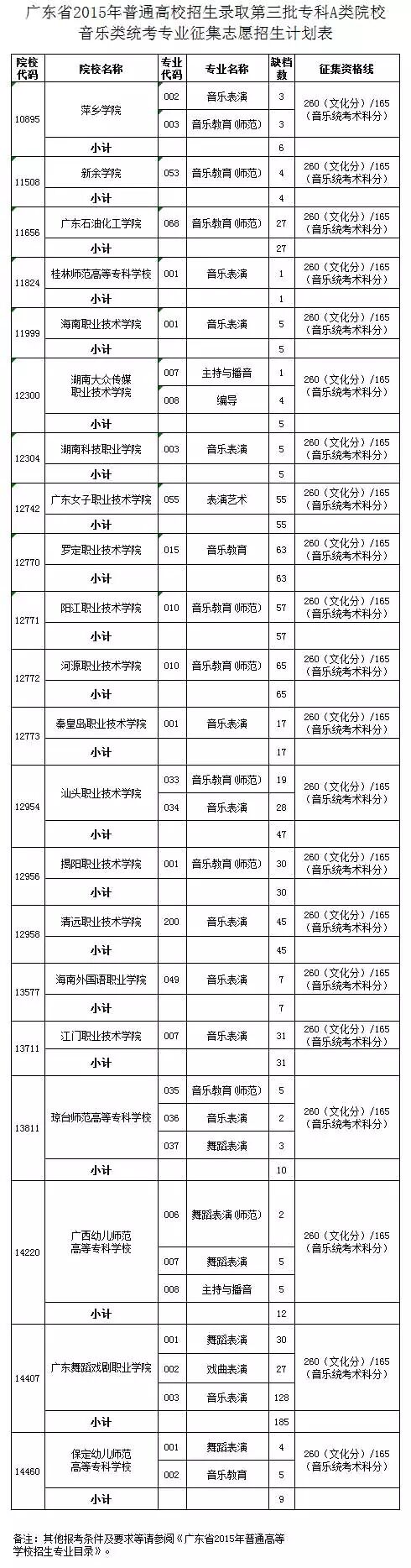 广东省2015年第三批专科A类院校(含普通类、体育类、美术类和音乐类)征集志愿招生计划表