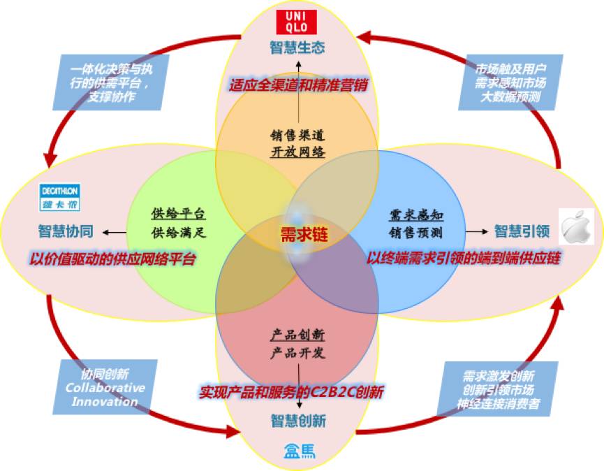 在新零售的驱使下,需求链也形成了包括智慧引领、智慧创新、智慧生态和智慧协同在内的全景图