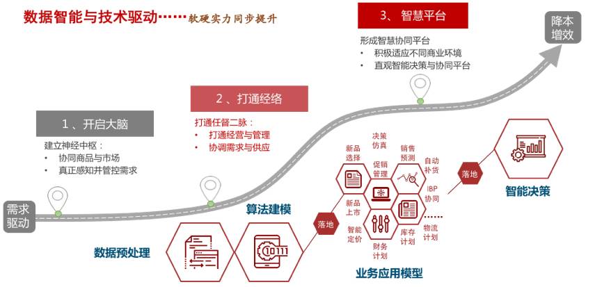 归纳一下,对于企业而言,真正的需求链变革或需求链软实力提升往往需要以下三个步骤,第一步是开启大脑,商品画像和店铺画像这种基础性工作都属于这一步,建立“商品”的神经中枢:去协同商品与市场,真正感知并管控需求;第二步再去打通经络,有效打通经营和管理,协调需求和供应,确保供需的匹配和平衡;第三步会真正迈入智慧化,通过对不同商业环境的模拟,对不同需求与供应决策的财务模拟,来积极适应不同的商业环境和真正实时智能的商业决策。