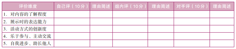 如上表中,老师给出五个评价维度,涉及阅读内容、阅读能力、阅读过程、阅读态度、阅读效果等多个方面,但仅仅提供评价维度,并加以一定的指导。学生对每个维度的把握,还要基于其自身的理解以及对被评价者的真实阅读基础的了解。打分之后,需要简要阐述评价的理由。