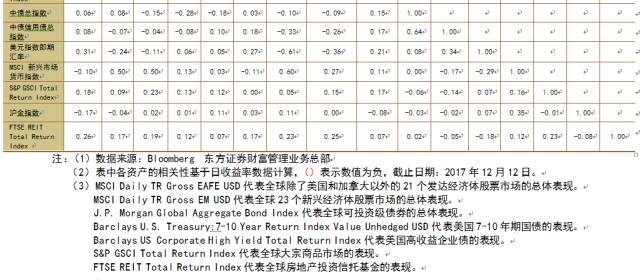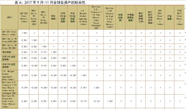 从2017年9月至2017年11月全球各类资产收益率的相关性看:下表中的各类资产大多呈现弱正相关性或负相关性,启示我们在全球资产配置时应考虑资产之间的相关性进行均衡配置。