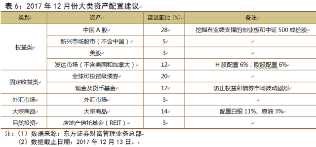 11月份,中国债券市场投资者情绪依然低迷,除了短融外,高收益债、高信用等级企业债、金融债等全线下调,国债微涨。当前,受资管新规、中国经济体杠杆率高企等因素影响下,、紧货币的预期较强,短期内,中国债券市场投资交易情绪难以好转。12月,继续低配债券市场,比重20%。11月份报告中,我们建议增加现金资产(现金及货币基金)的配比为10%,11月份不论是中国股票市场还是债券市场,都出现了像样的调整,组合中留有的现金是有机会加仓应对市场回调的。本月,我们增配现金资产(现金及货币基金)比重至12%,一方面应对市场出现大幅波动的风险,此外,临近年末,市场资金面可能出现偏紧情形,投资者可以关注国债逆回购等投资机会。