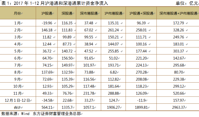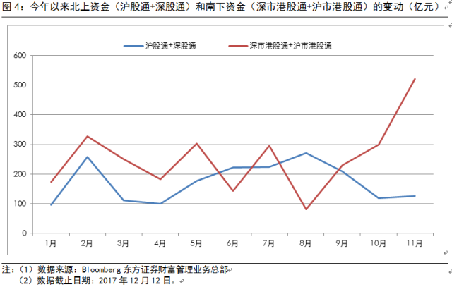 截止今年12月12日,南下资金(深市港股通+沪市港股通)合计2963.37亿元,远远超出北上资金(沪股通+深股通)1899.81亿元。8-11月,南下资金逐月增加,北上资金呈下降趋势,说明H股对内地投资者的吸引力强劲,A股对香港资金的吸引力在减弱,12月上旬双向资金均较11月同期降幅明显,表明A股和H股的投资者风险偏好有所回落。