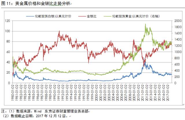 从美元指数与贵金属的对比图看,今年以来随着美元指数的走弱,对黄金的压制作用减弱,而银价今年始终处于区间震荡盘整状态。黄金和美元指数走势的负相关性较强,而白银价格相对稳定。从白银的历史走势来看,2014年至今,白银大部分时间处于16-20美元之间,配置一定的白银对组合具有稳定器的作用。我们不期待白银短时间内就有很亮眼的表现,但对其未来的表现持乐观态度,12月组合内增配白银比重至11%。