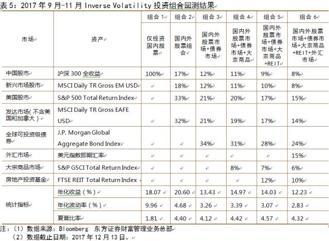 本文依据Inverse Volatility[1]方法回测了最近3个月的资产组合表现,回测结果表明:仅投资国内股票市场的投资组合夏普比率为1.81;若将资产按一定比例分配于全球其他新兴市场和发达市场(如组合2至组合6),夏普比率具有明显提升。