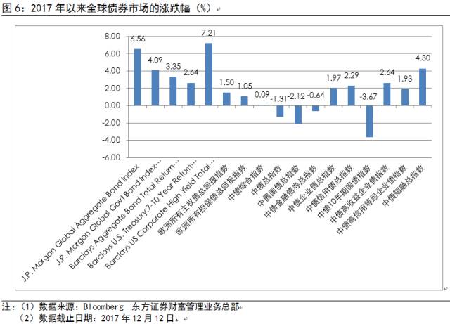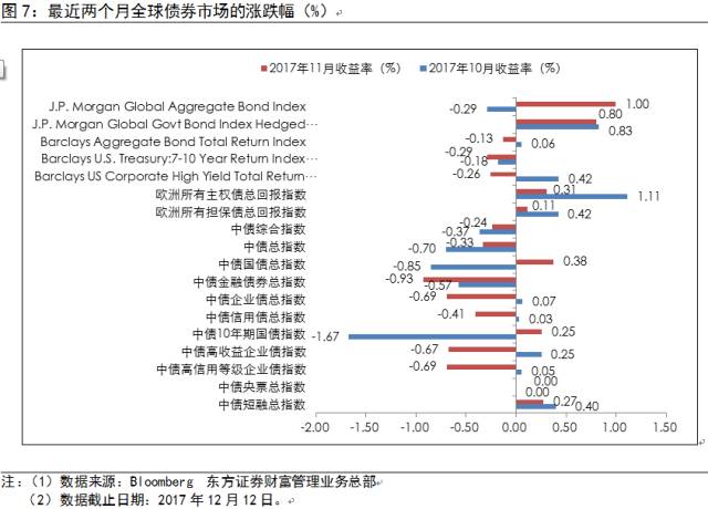 截止2017年11月12日,今年摩根全球可投资级债券指数上涨6.56%,美国高收益企业债上涨7.21%,美国7-10年期国债上涨2.64%。1.50%,而今年1-7月份这一指数累积涨幅还为-0.83%,。中国债券市场分化严重,企业债总体上涨1.97%,信用债总体上涨2.29%,而国债总体下跌2.12%,10年期国债下跌3.67%。