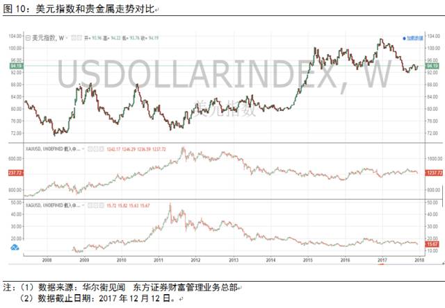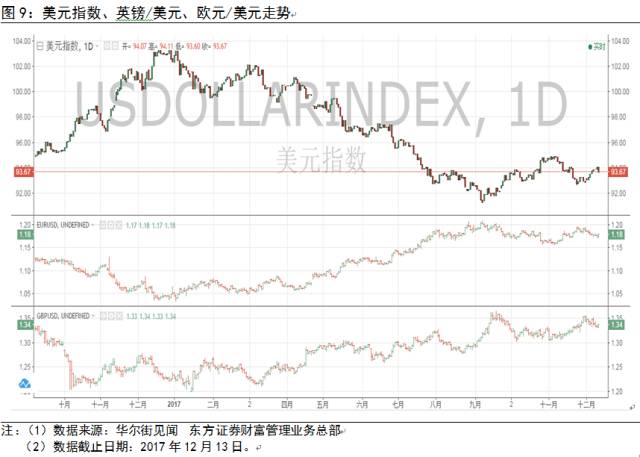 美元指数与英镑/美元、欧元/美元走势呈现较强的负相关性,美元指数年初以来下跌7.51%,英镑/美元、欧元/美元分别上涨8.61%、12.05%。今年9月曾一度跌至2014年底以来最低水平。不过之后在经济数据的刺激下,美元指数开始反弹,让一些机构重拾对美元的信心,进入10月份市场对美联储主席人选的讨论影响着美元指数走势,10月份市场曾预期鹰派人物泰勒会接替耶伦执掌美联储主席,美元指数随之大幅反弹,11月份,市场对美联储税改的进度再度关注,美国参众两院的税改方案当前存在较大差异,税改进程存在不确定性,美元指数大跌1.63%。进入12月份,随着税改进程的明朗化,美元指数反弹0.65%。
