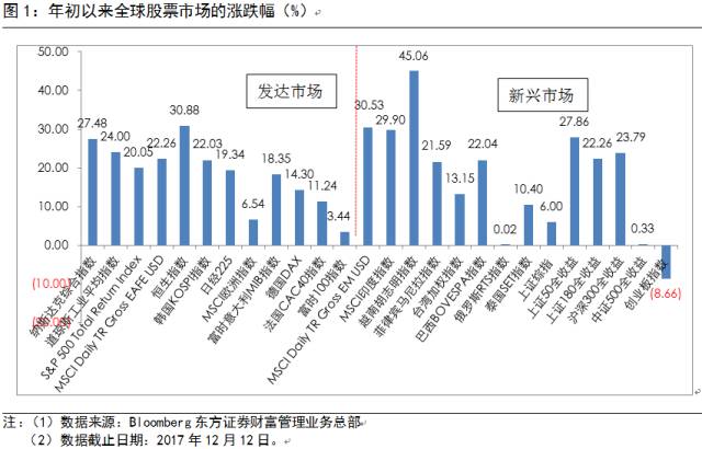 今年以来,全球股市走牛,代表发达市场和新兴市场的MSCI Daily TR Gross EAFE USD和MSCI Daily TRGross EM USD指数分别上涨22.26%和30.53%。越南股市领跑全球,越南胡志明指数涨幅高达45.06%,香港、印度股市涨幅位列第二、三位,恒生指数和MSCI印度指数涨幅分别达30.88%、29.90%。中国(以上证50指数、上证180、沪深300等指数衡量)、菲律宾、巴西、韩国、美国(以美国三大股指衡量)等市场均在20%-30%之间,德国、法国、意大利、台湾等市场涨幅均在10%-20%之间。