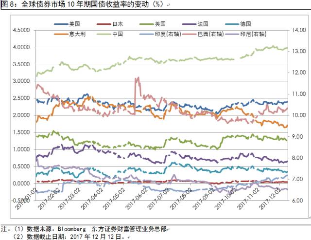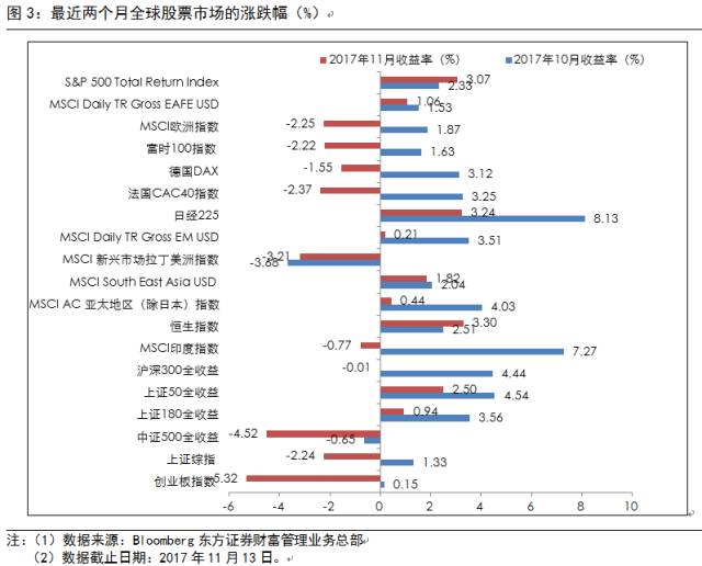11月,美国三大股指受到税改取得进展支撑继续飙升,年初以来,美国三大股指纳斯达克综合指数、道琼斯工业平均指数、S&P 500 Total ReturnIndex分别上涨了27.48%、24%、20.05%,即使税改法案顺利通过,我们依然对美股表示谨慎防止美国累积较大涨幅后的回调压力,12月份,低配美股配置比例为3%。