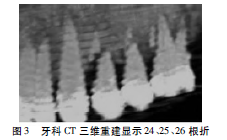 经牙科CT检查、三维重建后确诊:24、25、26根折并24根尖周炎(图3)。