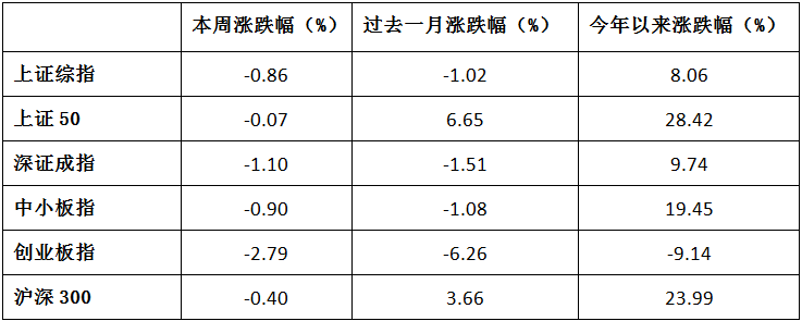 本周市场宽幅震荡,周一至周三上证综指收出三连阳,但周四创下年内最大单日跌幅,显示股指面临上行压力。周五沪指收出一根小阳线,但是量能显著萎缩。全周上证综指下跌0.86%。风格指数方面,创业板指本周下挫幅度最大,跌2.79%,中小板指也下跌0.90%,上证50和沪深300则跑赢大盘,分别下跌0.07%和0.40%。