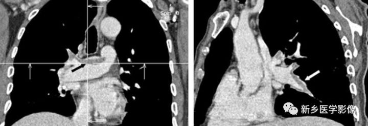 右肺中心性肺癌直接侵犯肺动脉,致肺动脉内癌栓形成(箭示)
