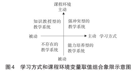 图4中两个变量的坐标轴垂直交叉,以学习方式为横轴,课程环境为纵轴,形成了四个象限区域:主动-主动区域、被动-主动区域、被动-被动区域、主动-被动区域。在主动-主动区域中,课程与学生的强势组合容易形成强冲突型的教学系统。在被动-被动区域中,课程与学生的消极组合使教学系统无法存在。在被动-主动区域中,学习方式与课程环境的取值存在匹配可能,被动学习方式要求课程环境承担更大的主体责任,要求课程给予确定性的意义内涵,这一区域的取值组合容易形成知识教授型的教学系统。在主动-被动区域中,学习方式与课程环境的取值也存在匹配可能,只是被动的课程环境要求学生承担更大的主体责任。建立在学生个性基础上的主体性使学生自主探寻课程环境所展示的意义空间,并根据自己所探知的意义来实现自身改变。客观化的知识不再是第一需要,主观化的经验成为内容主体。由此,主动-被动的取值组合最终将形成能力培养型的教学系统。