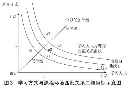 图3中横坐标表示学习方式,纵坐标表示课程环境,二者的取值范围在被动与主动之间,坐标原点表示绝对被动。由坐标原点沿坐标轴的正向移动,被动因素逐渐渐少,主动因素逐渐增多。从坐标原点发出的斜线表示学习任务的等级,等级反映了学习任务的复杂性水平。离坐标原点越近,表示学习任务的等级越低;离坐标原点越远,表示学习任务的等级越高。在确定的学习任务等级上,学习方式与课程环境的取值组合构成了该等级对应的学习方式与课程匹配的关系曲线。学习方式与课程环境反向的取值关系,使关系曲线呈现出类似反比例函数的特征。学习方式与课程匹配关系曲线并非固定,随着学习任务等级的变化,关系曲线也会在学习任务等级变化的方向上产生移动,形成无数的关系曲线集合。图中的曲线M、L、。当学习方式取值为a时,沿a做出一条垂直于横坐标的虚线,相交于曲线N、L、M于a1、a0和a2点。显然,三点在纵坐标上的取值大小顺序为,a2纵坐标大于aO纵坐标,a0纵坐标大于a1纵坐标。这意味着,保持学习方式不变,学习任务难度越高,课程的主动性应越强,这和人们的教学实践体验一致,因为学习任务越难,越需要学习支持和教学干预。当课程环境取值b时,沿b做出一条垂直于纵坐标的虚线,相交于曲线N、L、M于b1、aO和b2点。显然,三点在横坐标上的取值大小顺序为,b2横坐标大于aO横坐标,aO横坐标大于b1横坐标。这意味着,保持课程定位不变,学习任务的难度越高,学习的主动性应越强,这也和人们的教学实践体验相符。因为当课程环境不变时,学习任务越难,越需要学生更强的自主学习意识和能力。