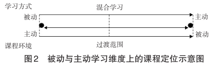 在实践中,完全被动或完全主动的学习方式不可能存在,可能出现的是包含着被动与主动两种因素的混合学习方式,被动与主动混合比例的变化使学习方式居于两种极端学习方式所构架的中间过渡区域,与之相应的课程环境自然也就形成了一个课程定位谱系,如图2所示。