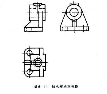 从图6-12a和图6-13中可以看出,该组合体(轴承座)以投射方向A所画出的视图作为主视图,并按其工作位置安放为较好。同时也要兼顾使其他视图上的虚线少,如取图6-13c为主视图的投射方向,就回使左视图上的虚线增多。最后确定的三视图,如图6-14所示。
