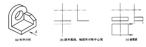 通常选组合体上平行于投影面的对称平面、底面(上或下)、端面(左、右、后、前)等积聚成直线的投影和垂直于投影面的回转轴线的三个投影(表示积聚成点的投影用对称中心线),作为画各视线的基线。