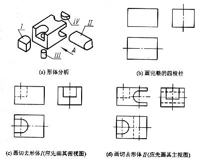 通常是先画外部较大的、整体堆叠组合的基本形体,后画内部较小的、细部挖切组合的基本形体,在逐个画每一基本形体的三视图时必须画完一基本形体的三视图后,才能画下一个基本形体,而且,一般先画投射为圆的视图,后画与其对应的非圆的视图(其轴线平行于投影面的),这种画图次序有利于保持投影关系,提高作图的准确性和作图的效率。