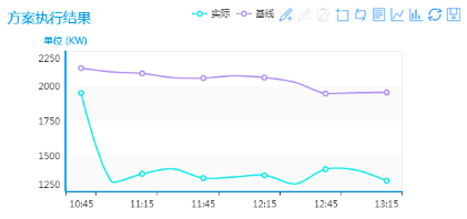 需求响应基准线是在非响应日中对应响应日事件执行时间段,每小时的电力负荷,需求响应削减负荷量是通过响应事件实际负荷和基准线对比得到的。途中紫色曲线为该用户基准线,蓝色曲线为响应日实际负荷曲线,实际负荷与基准负荷之间的差值即为需求响应削减负荷量。