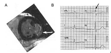 图9 左室侧壁梗死的核磁影像及对应导联心电图 365医学网 转载请注明