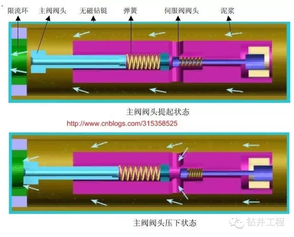 仪器是将传感器测得的井下参数按照一定的方式进行编码,产生脉冲信号,该脉冲信号控制伺服阀阀头的运动,利用循环的泥浆使主阀阀头产生同步的运动,这样就控制了主阀阀头与下面的限流环之间的泥浆流通面积。在主阀阀头提起状态下,钻柱内的泥浆可以较顺利地从限流环通过;在主阀阀头压下状态时,泥浆流通面积减小,从而在钻柱内产生了一个正的泥浆压力脉冲。定向探管产生的脉冲信号控制着主阀阀头提起或压下状态的时间,从而控制了脉冲的宽度和间隔。主阀阀头与限流环之间的泥浆流通面积决定着信号的强弱,我们可以通过选择主阀阀头的外径和限流环的内径尺寸来控制信号强弱,使之适用于不同井眼、不同排量、不同井深的工作环境。实际上,整个过程涉及到如何在井下获得参数以及如何将这些数据输送到地面,这两个功能分别由探管和泥浆脉冲发生器完成。
