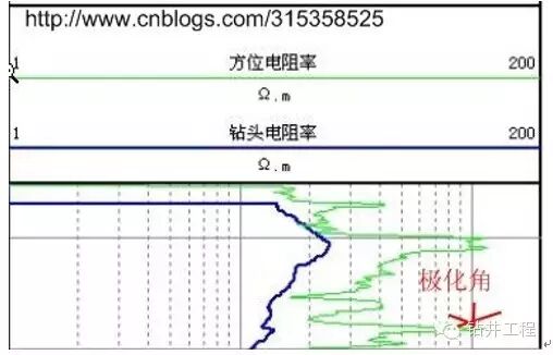 识别地层界面的方法,可以使用极化角,它的产生是由于仪器的原因引起的,当随钻测井仪器在井眼轨迹与地层界面夹角小于30度进入另一个地层,并且地层界面两侧电阻率由差别时,在目的层就会产生一个电流激增来干扰仪器发出的传播波,仪器接收到被干扰的电流后引起电阻率测量值的激增,然后迅速回到正常值。界面两侧电阻率差别越大,这种激增就越大:并且一般浅电阻率比深电阻率更容易产生这种现象