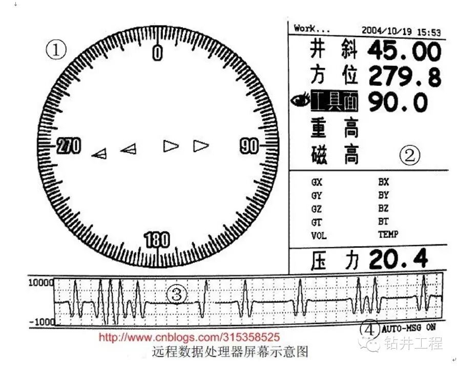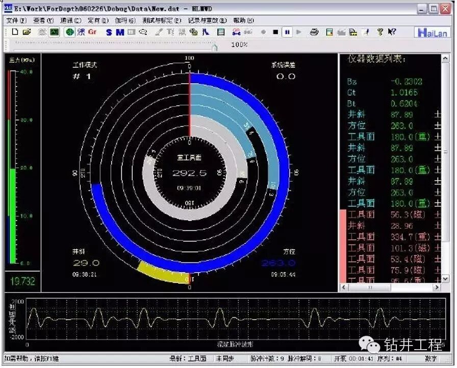 上图是司钻读出器,读出当前的井段数据。图中象雷达一样的就是工具面,详细作用可以参考资料2,书中有详细的叙述。那么这个雷达一样的工具面有什么作用呢?把它用360度来划分,那么当红线指零度时是增斜,指180度时是降斜,90度时是增方位,270度是降方位。在特殊井轨道设计这个软件中,这四个度指起着非常重要的作用,我们在下面一节的内容里会介绍它是如何重要的。