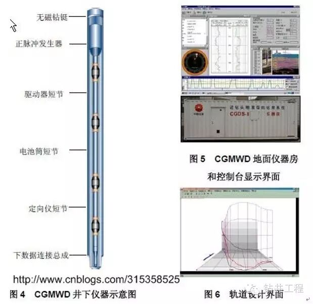 CGMWD正脉冲无线随钻测量系统包括CGMWD-MD井下仪器 (图4)和CGMWD-MS地面装备(图5)。二者通过钻柱内泥浆通道中的压力脉冲信号进行通信,并协调工作,实现钻井过程中井下工具的状态、井下工况及有关测量参数(包括井斜、方位、工具面等定向参数,伽马、电阻率等地质参数,及钻压等其他工程参数)的实时监测。地面装备部分由地面传感器(压力传感器、深度传感器、泵冲传感器等)、仪器房、前端接收机及地面信号处理装置、主机及外围设备与相关软件组成,具有较强的信号处理和识别能力,可传深度4500m以上。地下仪器部分由无磁钻铤和装在无磁钻铤中的正脉冲发生器、驱动器短节、电池筒短节、定向仪短节、下数据连接总成组成。上接普通(或无磁)钻铤,下接无线短传接收系统。由于采用开放式总线设计,该仪器可兼容其它型号的脉冲发生器正常工作。除用于CGDS-Ⅰ近钻头地质导向钻井系统作为信息传输通道外,还可用于其他钻井作业。
