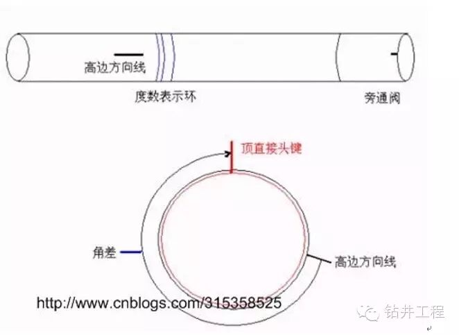 上图的上面的钻具为螺杆,下图将定向接头的定向键和高边方向线平移到同一个平面来计算角差。从高边顺时针旋转到顶直接头键的位置,用直尺量是多少,在量出一圈的周长,则可以算出角差是多少度,在司钻显示器和轨迹控制软件上所显示的出的工具面是已经把角差带入后计算好的。