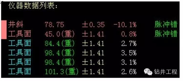 表中的数据依新旧次序自下向上排列,最多可以容纳22 个数据。数据量超过22 个之后,旧的数据向上滚动,新数据追加在最下面一行。工具面的性质(磁/重)以文字形式标注于数据之后,如上图所示。