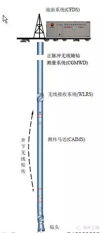 下面介绍下,近钻头地质导向的结构组成。CGDS-Ⅰ近钻头地质导向钻井系统由测传马达(CAIMS)、无线接收系统(WLRS)、正脉冲无线随钻测量系统(CGMWD)和地面信息处理与导向决策软件系统(CFDS)组成。