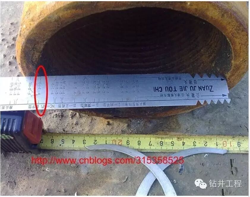 如上图,我用下面的直尺量出的扣型大小并不准确,不信你可以去试试。而用上面专用的接头尺量,不但可以量出扣型也可以量出大小。非常的准确。大家可以放大图中的红圈的地方仔细读数,此为5寸钻杆的母扣,时410的扣型。