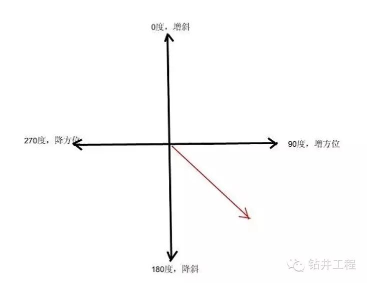 4)井斜方位角:是以正北方位线为始边,顺时针旋转至井斜方位线所转过的角度。