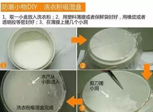 洗衣粉也是好用的除湿剂。打开新的盒装洗衣粉(或将旧的倒入用完的除湿盒中),在塑料膜上戳几个小洞,放在任何需要除湿的角落。洗衣粉吸饱水分结块后可拿去清洗衣服,一点也不浪费。
