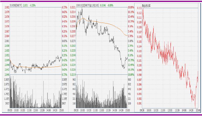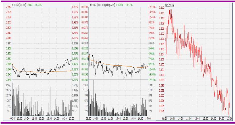 图表9:50ETF与11月平值认沽期权“50ETF沽11月2850”日内走势图及隐含波动率走势图