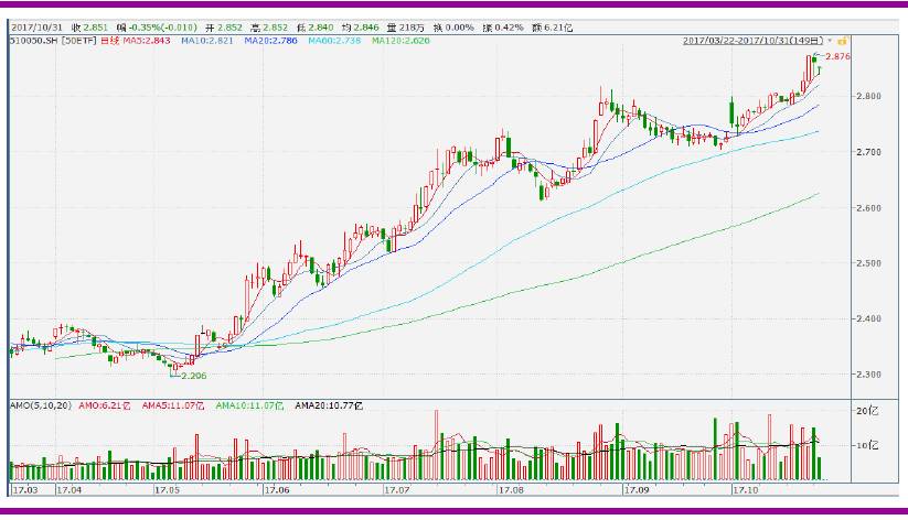 上证50ETF收市价2.851,跌0.010,跌幅0.35%,成交金额6.21亿。