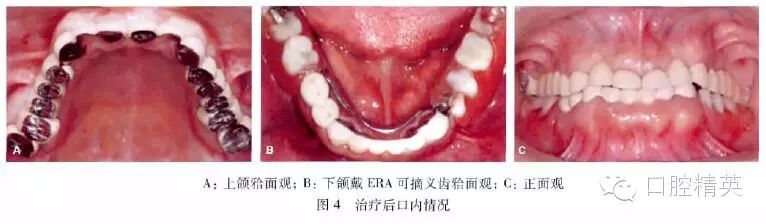 ④完成修复:临床试戴、调牙合,临时性粘固。经试戴合适后,永久性粘固烤瓷桥。然后佩戴太极扣可摘义齿,调牙合(图4)。