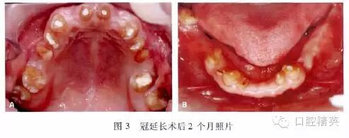 ②外科治疗、牙周治疗和根管治疗:拔除2 2,71 1457,剩余牙根进行冠延长术(图3)。6周后,剩余牙齿进行根管治疗。