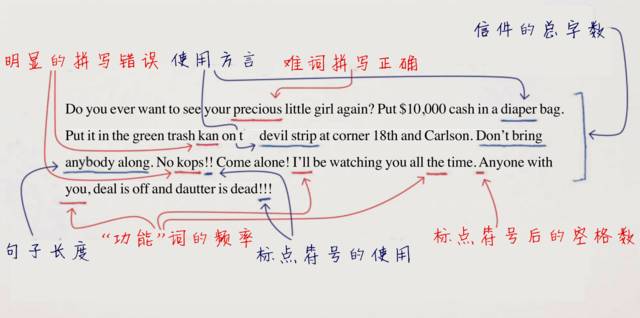 可惜的是,一般人在这一点上总显得业余,很少有人能用恰当的修改伪装自己。比如在“devil strip”的案子里,那个勒索者故意拼错了一些单词(把“cop”拼成“kop”,“can”拼成“kan”),想以此伪装成一个文化程度不高的人。但这个文字计谋并未得逞,因为他反倒把一些难词拼对了,这个矛盾戳穿了他的伪装。