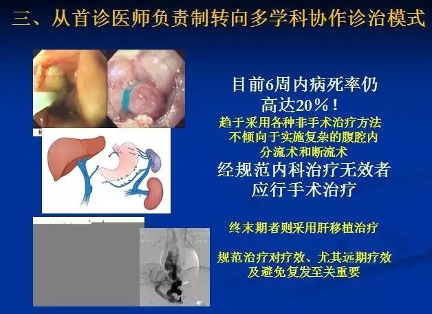 目前患者6周内病死率仍高达20%!所以应该采取多学科协作治疗,趋于采用各种非手术治疗方法,不倾向于实施复杂的腹腔内分流术和断流术。经规范内科治疗无效者,应行手术治疗。终末期者则采用肝移植治疗。