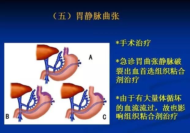 治疗时可以进行手术治疗,急诊胃曲张静脉破裂出血首选组织粘合剂治疗。由于有大量体循坏的血流流过,故也影响组织粘合剂治疗。国外报道,可以经球囊导管阻塞下逆行闭塞静脉曲张术(BORTO)治疗。