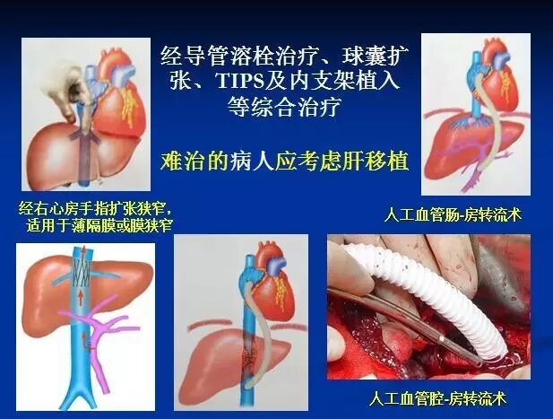这主要是异源性肝脏血管疾病,发展中国家发病率較高,可以合并食管胃静脉曲张出血、脾亢、胆病和胃病。这类患者应根据个体化原则采取多学科综合治疗,此类病人大多因有正常肝脏,多不必行肝移植。