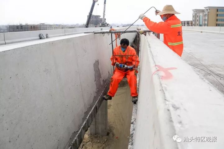 中铁大桥局集团九公司承建位于潮南区两英镇的第A4合同段,路线全长7365米,主线上设特大桥3座、大桥1座。揭惠高速A4标项目部党支部书记邓宁告诉记者,他们是2014年5月正式开工建设的,高峰期现场有300多名施工人员和40多台各类施工设备。在当地各级党政和基层村居的支持配合下,施工单位克服征地拆迁和高压线迁改等困难,风雨无阻,实干苦干,今年9月全面完成了主线建设。目前,项目部仍有近100名工人在进行复查、检测和路面伸缩缝施工。