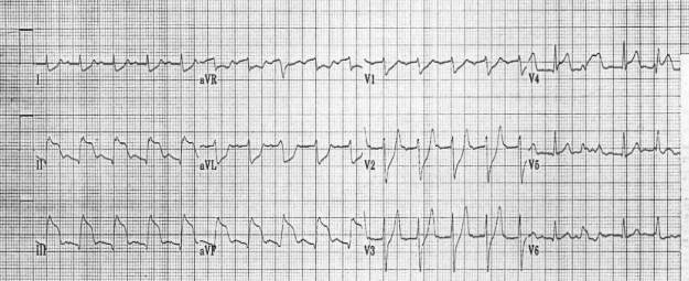 近段前壁心肌梗死, V2 、 V3 ST段抬高,此外V1ST段抬高, V5、V6、 II、III、aVF压低. 肢 导aVR抬高.