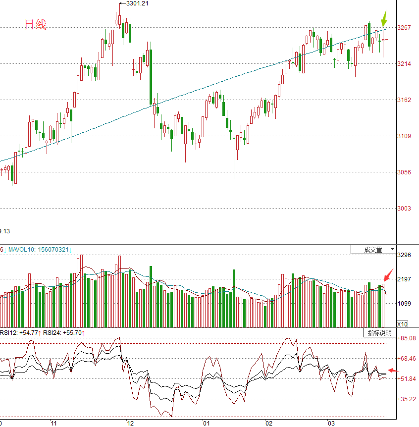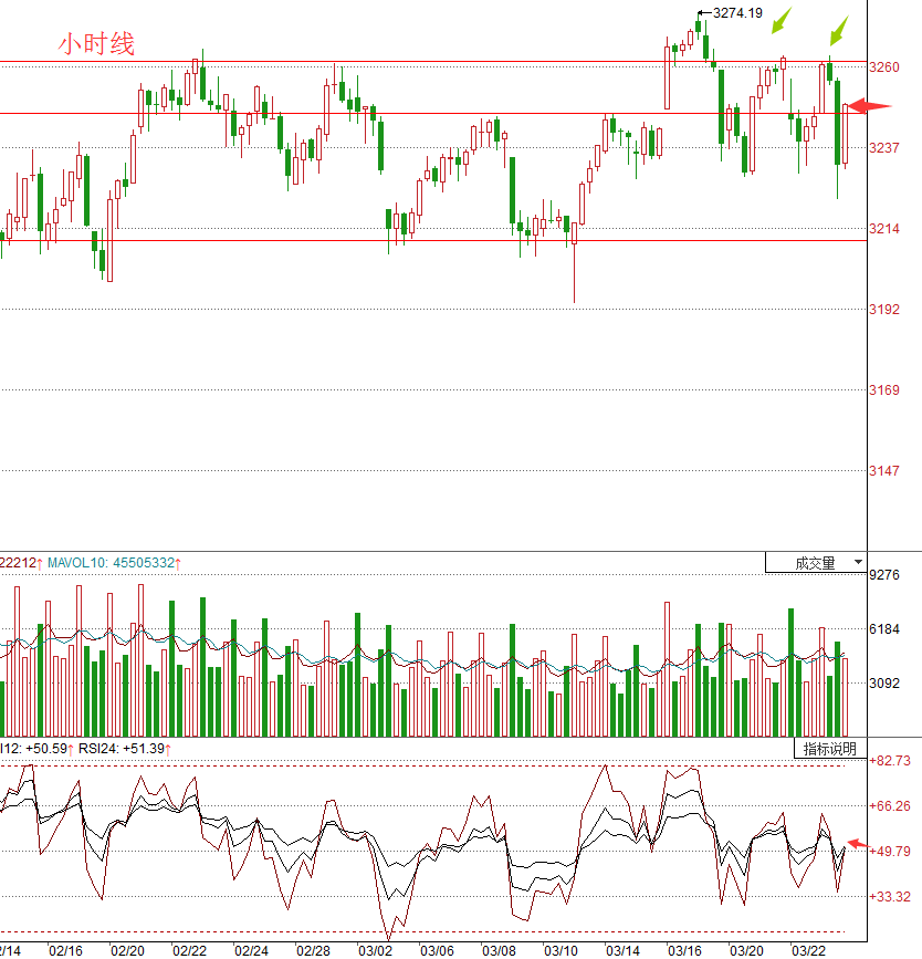 小时线于3260点一线受阻后快速回落,在3228点处获得支撑。,但是量能却明显不足,所以短期还需反复。
