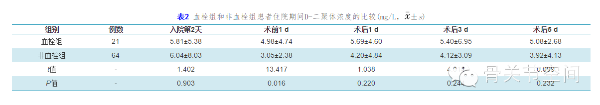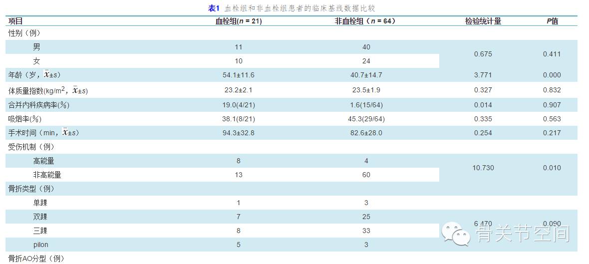 本研究中所有患者手术方式均为切开复位内固定,麻醉方式均为全身麻醉,血栓组与非血栓组患者的性别、体质量指数、是否合并内科疾病、是否吸烟、手术时间等比较差异均无统计学意义(P > 0.05)。但通常来说这些项目也会影响DVT的发生,可能是由于本研究样本量较小等原因导致。加之本研究重点并不在于DVT的影响因素,故也不就此展开过多讨论。