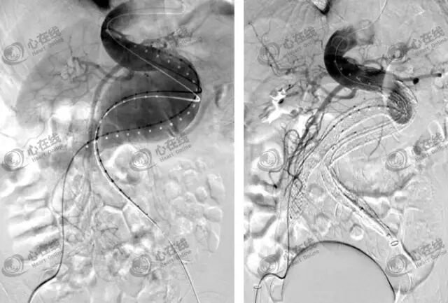 血管造影为诊断金标准,血管腔内腹主动脉瘤修复(EVAR)术中常规显示主动脉腔及分支血管病变,可指导治疗策略选择。