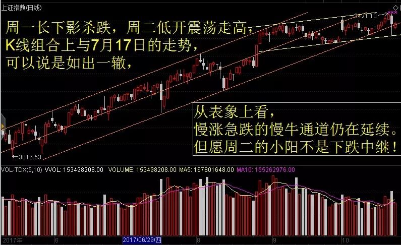 另外,从技术形态来看,周一的长下影杀跌之后,周二低开震荡走高,K线组合上与7月17日的走势基本是如出一辙,说明市场慢涨急跌的慢牛通道仍在延续。
