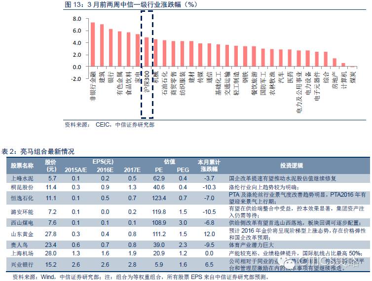 配置建议:维持现状,少动为妙。3月月报我们明确建议建抓大放小。上周,考虑到防御的重要性在上升,我们把银行业权重上调,把基础化工权重下调。从最新宏观数据及中观层面来看,房地产数据好于预期,水泥、煤炭、化工品价格仍在上涨,预计随着开工旺季到来这种态势会维持。考虑到市场走势的不确定性在上升,在配置上我们建议维持现状,少动为妙。本周亮马行业与个股组合均保持不变。