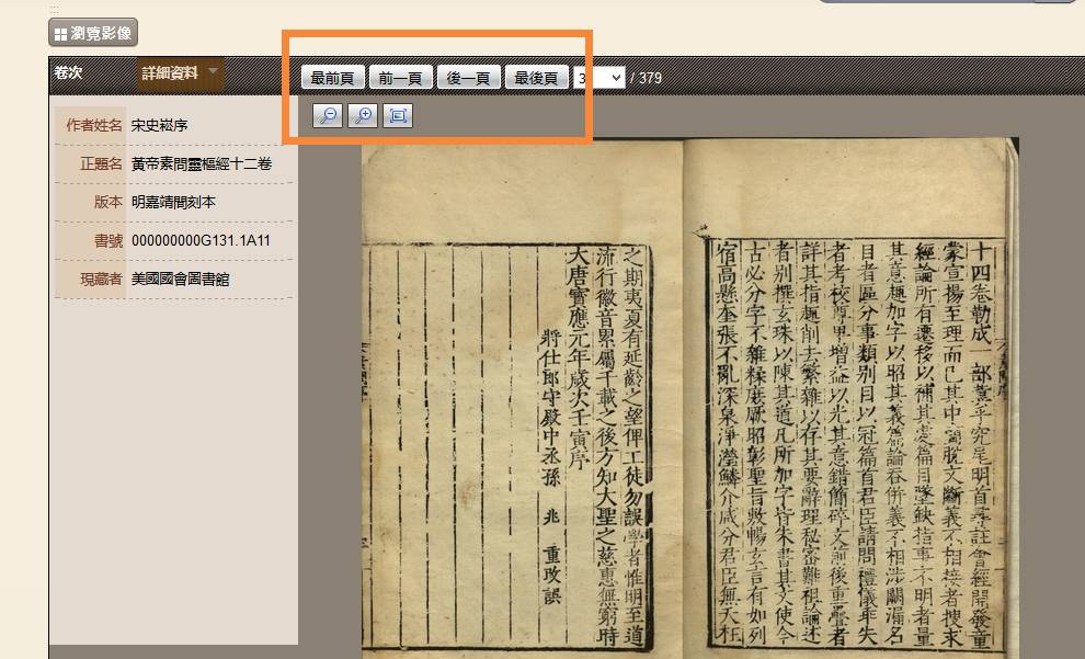 可以看到第二个链接是有图像的,那就点开它,然后就可以看到下图的页面,左侧有书籍的基本信息介绍,橙色框里可以进行翻页和图像大小的调节。
